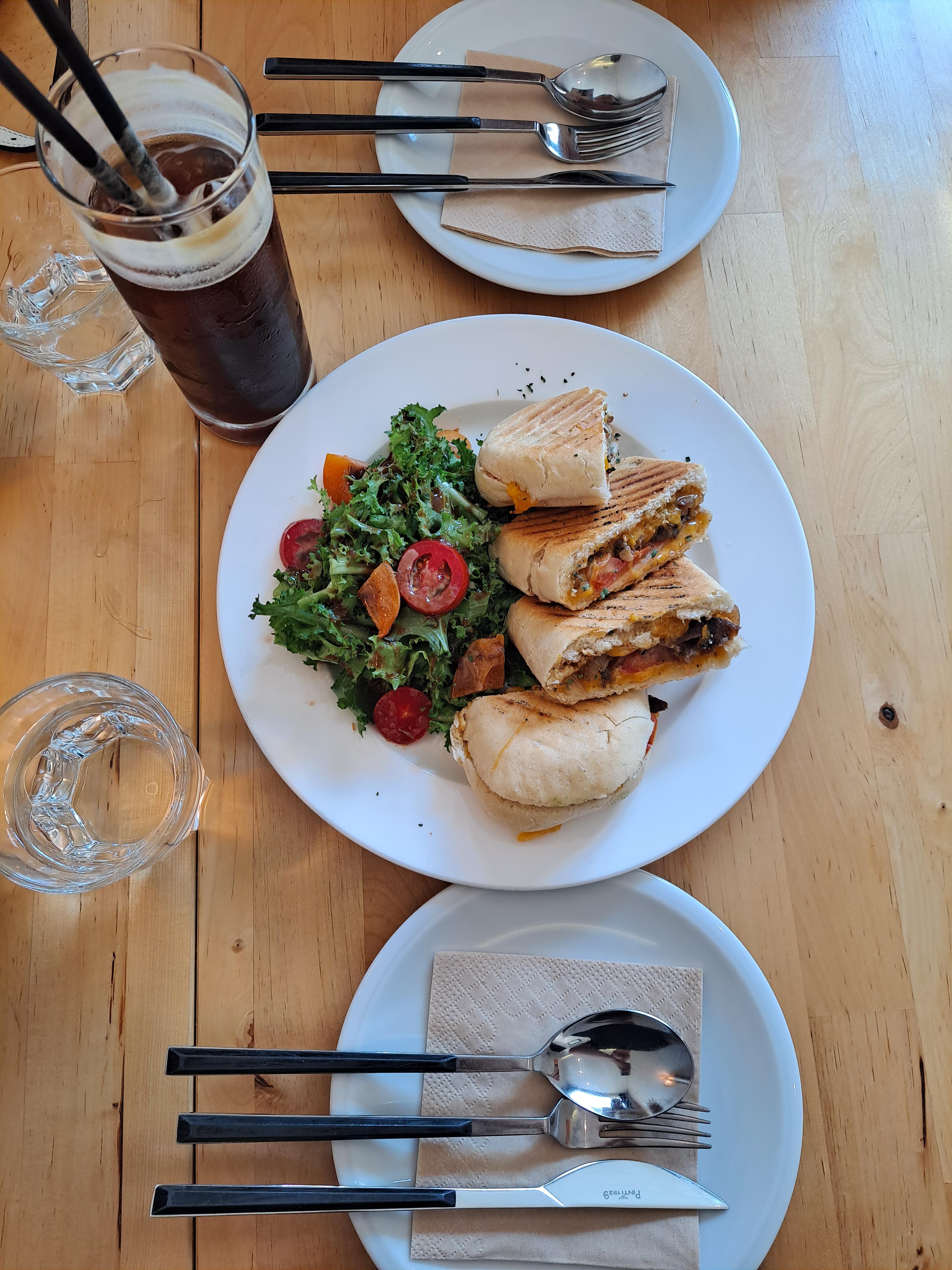 그리고 우리는 항상 배고프지 않지만 배고프기에 (we are not hungry but hungry~) 슬리핑 테이블에서 간단히 요기를 하고 영화를 보기로 했다. 그래도 이렇게 '먹고-먹고-먹고'를 한 적은 없었던 거 같다.. 그럼에도 ㅈㄴ 맛있었다. 4시쯤 갔는데 확실히 식사 시간이 아니어서 그런지 우리 밖에 없었다. (그래서 좋았다 ㅎㅎ). 가정집을 꾸민 듯한 인테리어에 음식도 미쳤다. 파니니를 잘하는 집이라는데, ㄹㅇ 파니니가 쩐다. 아래 비프앤 치즈 파니니는 겉바속촉의 결정체! 소불고기랑 체다 치즈가 들어가 있는데 ㄹㅇ 꾸덕함이랑 맛 조화 미쳤다..샐러드 드레싱(발사믹?)도 진짜 맛있었다. 그리고 방울 토마토랑 살구도 들어가 있었는데 존맛 ㅠㅠ
