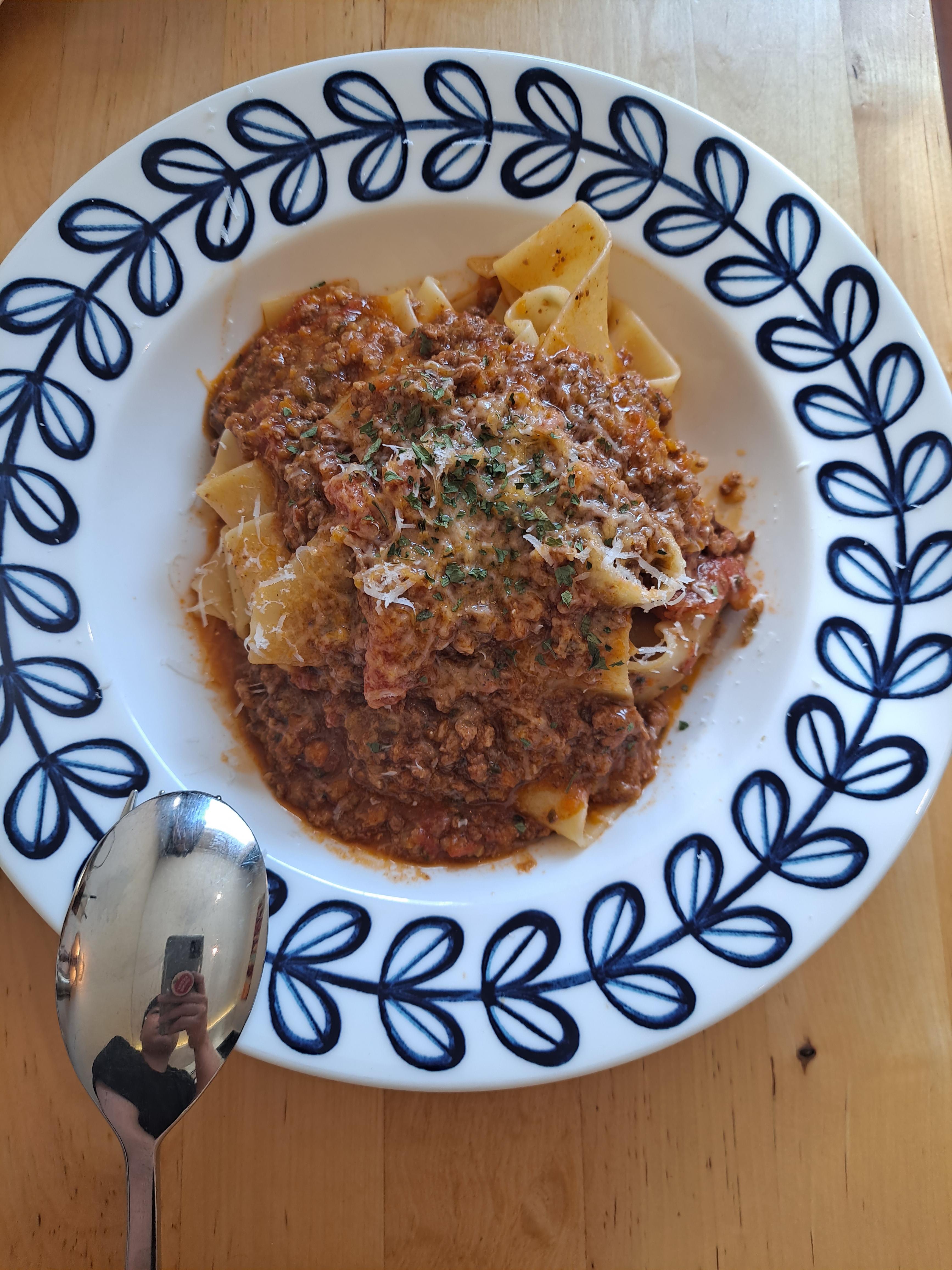 라구 파스타(?)는 파니니를 절반 쯤 먹었을 때 나왔는데 얘도 장난 아니다. 내가 먹어본 음식 중에는 라자냐랑 좀 비슷한 거 같은데 토마토, 고기 향이 쎄게 올라오긴 한다. 면도 얊고 넓적한 면을 쓰는데 소스가 잘 베는 거 같아서 정말 맛있게 먹었다. 그리고 아아를 시키길 정말 잘한것 같다 ㅎㅎ 딱 적당히 시원함을 주면서 음식이랑도 잘 어울렸다 ㅎㅎ
